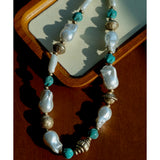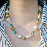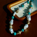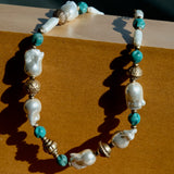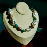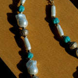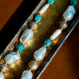 エメラルドブルーの石や凸凹としたバロックパールを組み合わせた首飾り。神秘性と芸術性を兼ね備えた美しきアイテム。カリブ海の女神みたいに演出してくれる。帆をあげて、風を受け、まだ見ぬ大地の財宝探しに出かけましょう。
