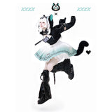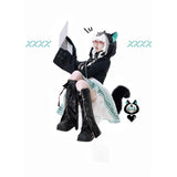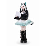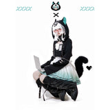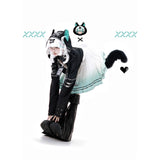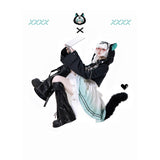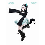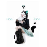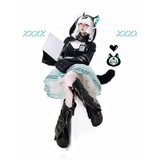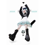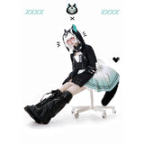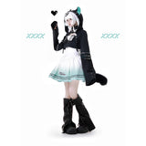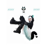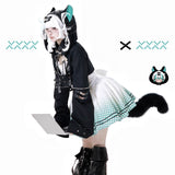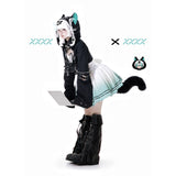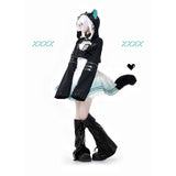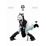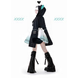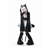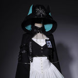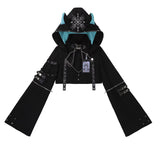 黒を基調としたクロップド丈のフード付きジャケット。両袖やフロントにあしらわれた多数のハトメとベルト装飾が、ハードなパンク感を演出。フードには猫耳風の立体パーツが付き、ストリート系×バーチャル要素が融合したユニークなアイテムとなっています。