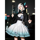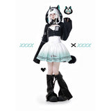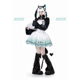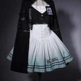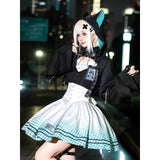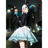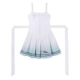 近未来感のあるサイバーデザインが特徴のストラップワンピース。ホワイトを基調に、裾に向かってグラデーションになったエメラルドグリーンのドット柄が印象的で、スカートには「LOADING…」のロゴがプリントされ、デジタルモチーフを表現しています。ボディラインに沿うコルセット風のフロントデザインが、可愛さとシャープさを両立しています。
