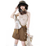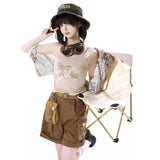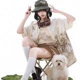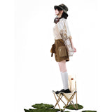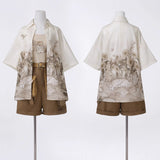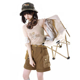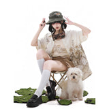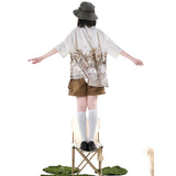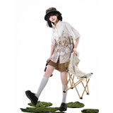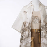 咲き誇る花々に囲まれた庭園でくつろぐ子猫を描いたブラウスと、ちょこんと座った子猫を描いたキャミソールワンピースと、ポケットのついたショートパンツ。ブラウスは、柔らかな生成り地に、淡いセピア調のイラストが繊細に描かれています。花々の上では蝶々が舞い、陽だまりの中で心地よく昼寝をしたり、芳しい花の香りを嗅いだりしながら、時間の流れに逆らわずに過ごすのんびりとした子猫の日常。キャミソールは、ミルクベージュの優しい色合いのアイテムで、フロント中央に猫と「Cat garden」のロゴが刺繍されたキュートなデザイン。ハーフパンツは、深みのあるブラウンカラーを基調に、左右非対称のカーキポケットがアクセントとなっています。ウエストベルト付きでシルエット調整が可能。ワーク風の機能的かつおしゃれなディテールが特徴的。