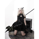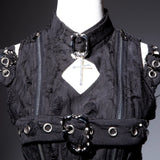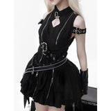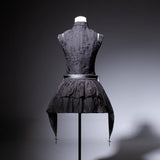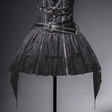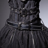 美が自らの完璧さに酔いしれ、破滅をも芸術に変えてしまう危険な魅力を放つノースリーブワンピース。わざと解れさせた生地が、退廃的な美しさを醸し出しています。複数のベルトやシルバーバックル、ジッパーディテールが、パンクテイストを強調しています。スカート部分は段になったレイヤー構造で、左右非対称の裾からは小さなクロスチャームが垂れ下がり、細部までこだわりが感じられます。