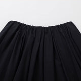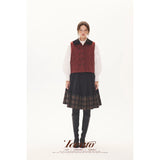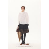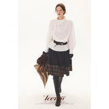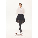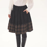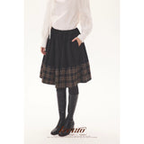黒を基調に、裾に向かって静かに表情を変えるスカート。黒地の落ち着きから、裾先でクラシカルなチェック柄が現れる二層の構成が印象的。控えめなボリューム感とミディ丈のバランスが、品のある日常と物語性を同時にまとわせています。素朴さの中に知性と郷愁を忍ばせた佇まいをつくり出しています。
