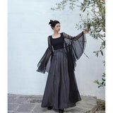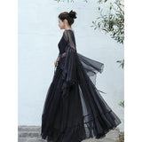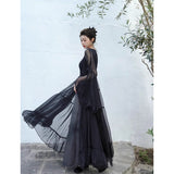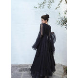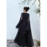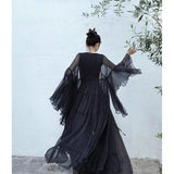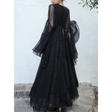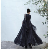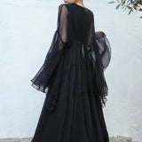 きらめく光を纏って。極めて軽やかで透明感のあるシフォン素材のロングカーディガン。たっぷりと贅沢な生地使いで、ゆったりとした袖と流れるようなシルエットが特徴的。風をはらんでふわりと舞い上がる様子はまるで天女の羽衣のよう。儚げで幻想的なムードを添えてくれる一枚。