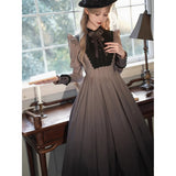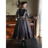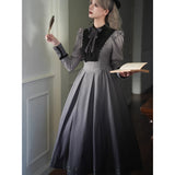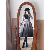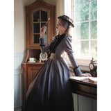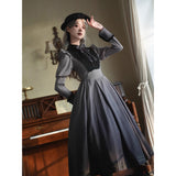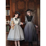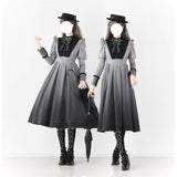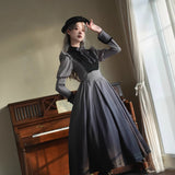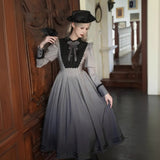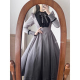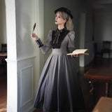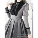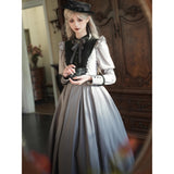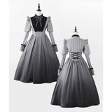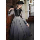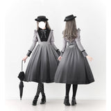 霧の都・ロンドンを思わせる灰色。ヴィクトリア時代のお嬢様みたいに演出してくれるクラシカルなワンピース。胸元にはブラックの胸当てが装飾されており、膨らみのある肩部分と、折り返された袖口が印象的。肩まわりにはフリルが装飾されています。バックには美しいシルエットとなるように編み上げが装飾されています。