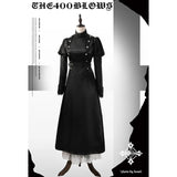 闇と光、厳格さと繊細さが均衡した、沈黙を語るようなワンピースとフードケープ。身体の線を厳格に包み込むロングワンピースと、その上に重ねられたフード付きケープが一体となり、修道服や軍装を思わせる端正さと、どこか物語的な緊張感を纏っています。高く立ち上がる首元から胸元にかけては装飾を抑えた構築的なラインが続き、ダブルボタンやウエストのベルトディテールが禁欲的な美しさを強調し、スカート部分には縦に走る切り替えとスリットが静かな動きを与えています。