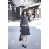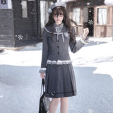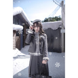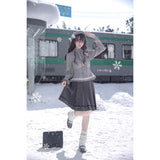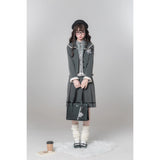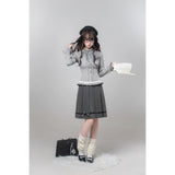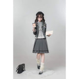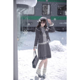 知性と上品さを秘めた令嬢のスクールスタイル。丁寧な装飾と落ち着いた色合いが調和した、少女らしさとエレガンスを併せ持つクラシックスタイルのジャケットとブラウスとプリーツスカート。丸襟にレースをあしらったジャケットは、くるみボタンと小さなリボン付きポケットが愛らしい。インナーのブラウスは細かなストライプにフリルとリボンタイを添え、同系色ながら表情豊かなクラシカルフェミニンを演出しています。スカートは上品な丈感のグレープリーツに黒リボンのワンポイントを施すことで、知的でレトロなムードを引き立てています。