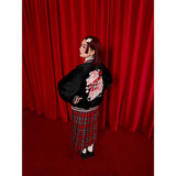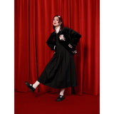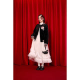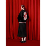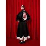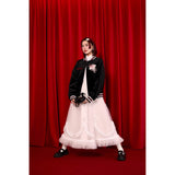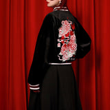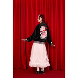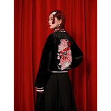 漆黒のベルベットがほのかな光を含んで静かに艶めくスカジャン。背面いっぱいに施された紫陽花の花と蝶々の刺繍が立体的に浮かび上がり、クラシカルなリブの襟と袖口が全体を引き締めています。短めの丈と柔らかな落ち感が佇む姿に余白と気品を与え、強さと可憐さ、舞台衣装のような緊張感と日常に溶け込む軽やかさを同時に宿しています。
