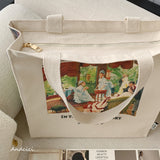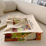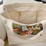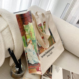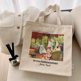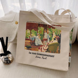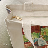 ジェームズ・ティソの『温室でのティータイム』を描いたトートバッグ。そこは社交会の人々が集う午後のお茶会。豪華絢爛なドレスを着飾ったご婦人がお喋りに興じており、窓の外の庭には珍しいエキゾチックな植物が植えられ、部屋の中には18世紀の東洋美術品が飾られています。厚手のキャンバス生地で作られており、たっぷりの収納力が嬉しい。内側にはポケットが付属しています。パソコンやお気に入りの本を詰めてお出掛けしてみて。