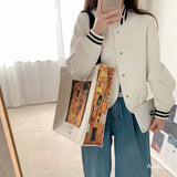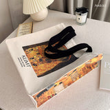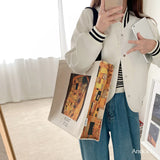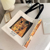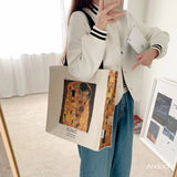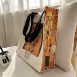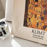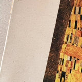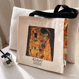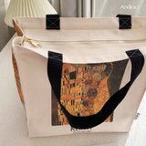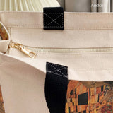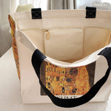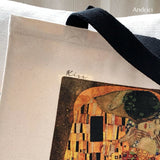 グスタフ・クリムトの『接吻』を描いたトートバッグ。黄金のベールに包まれて、抱き合い、頬に口づけをする官能的な絵画。厚手のキャンバス生地で作られており、たっぷりの収納力が嬉しい。内側にはポケットが付属しています。パソコンやお気に入りの本を詰めてお出掛けしてみて。