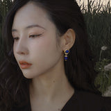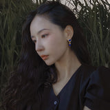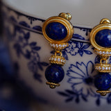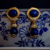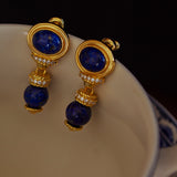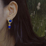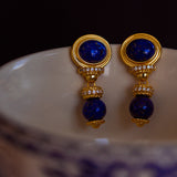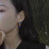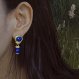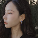 青色の美しい宝石の瑠璃を使ったピアス。眩い群青の地中海ブルーのような、あるいは吸い込まれそうになる銀河みたいな鮮やかな色合い。神秘的な美しさに引き込まれます。流行に左右されないレトロな雰囲気が漂います。