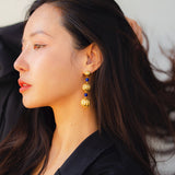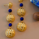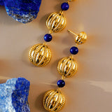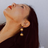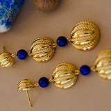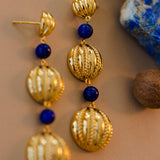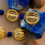 黄金に輝くナツメグの種と、青色の美しい宝石の瑠璃を連ね合わせたピアス。ふっくらと膨らんだ黄金の装飾が艶やかに輝いています。古代西洋の貴族令嬢が身につけていたようなアンティークな雰囲気が漂うアイテムです。