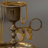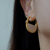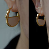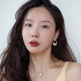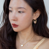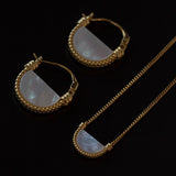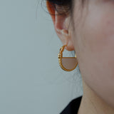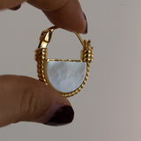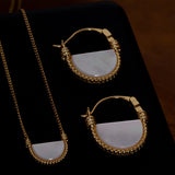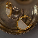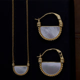 艶やかな光を放つ白蝶貝を、縄のように縛られた金色の装飾で包み込んだピアスとネックレス。古代ローマ建築のアーチから着想を得た丸みを帯びた曲線美。流行に左右されないレトロなアイテム。