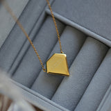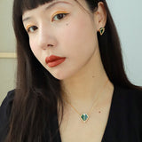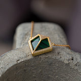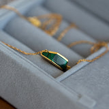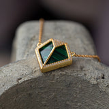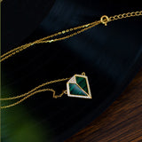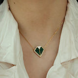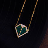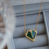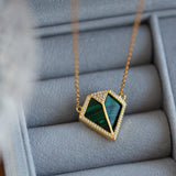 美しい”緑”が神秘的な孔雀石のネックレス。幾何学的な五角形に縁取られたアイテムは煌びやかに輝いています。永遠の愛は果たしてあるのだろうか。小ぶりながら存在感のあるレトロなアイテム。