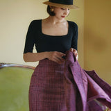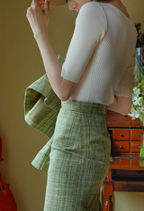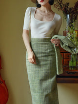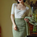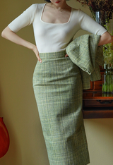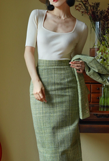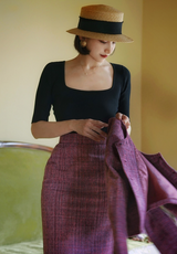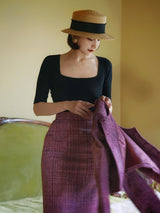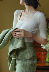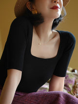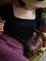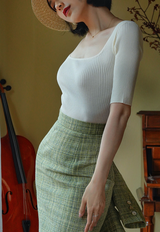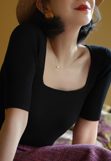 スクエアネックが首回りを美しく魅せてくれるスリムニット。しなやかな女性らしいフォルムを演出してくれるアイテムです。細身スタイルでフェミニンな印象を与えてくれる。ハイウエストなボトムスとの相性が良いです。