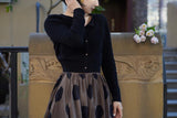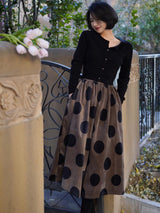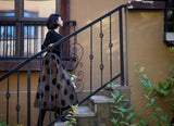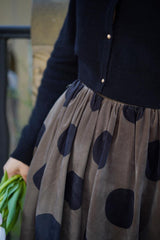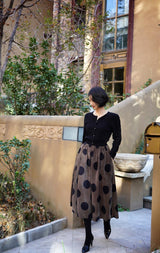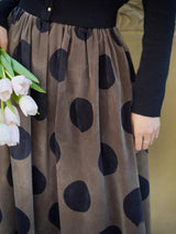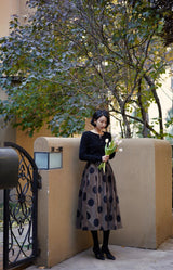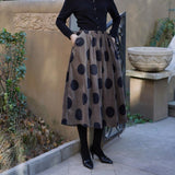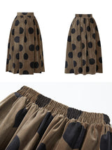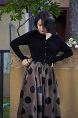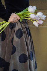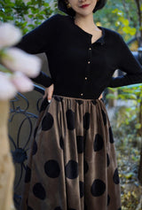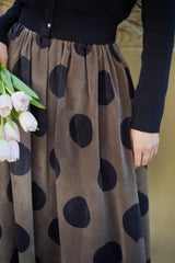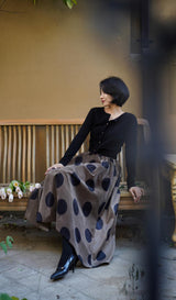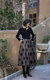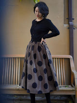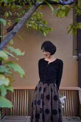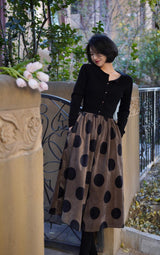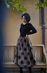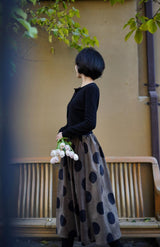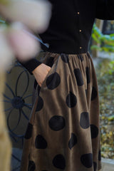 レトロな雰囲気を演出してくれる水玉模様のアンブレラスカート。エレガントな淑女を一層華やかに演出してくれるベルベットのアイテムです。ボリュームのあるスタイルながら、ふわっと広がるシルエットが美しい。ウエストの後ろ側はゴムになっています。