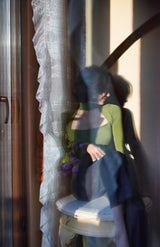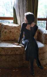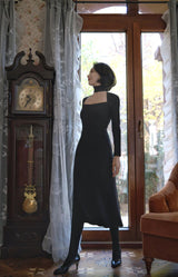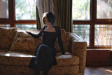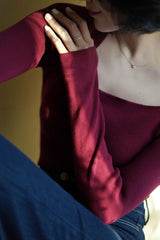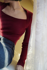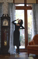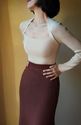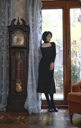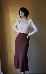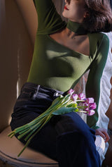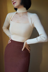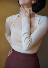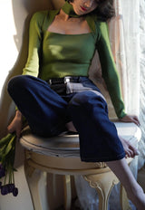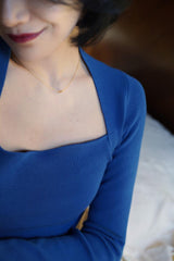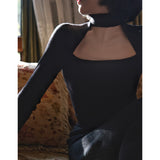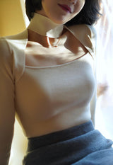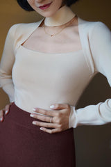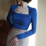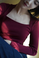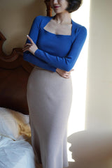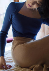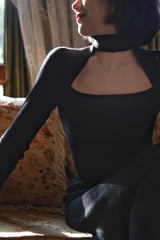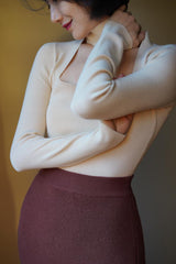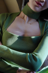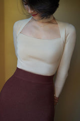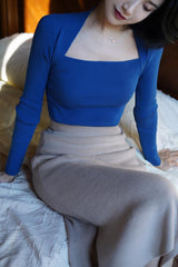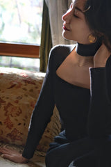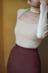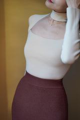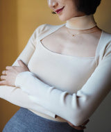 妖艶な雰囲気に頬が緩んでしまうスリムニット。チョーカーが付属したスクエアネックのアイテムです。ブルー、グリーン、ブラック、ワインレッド、オフホワイトの5色ご用意しております。程よい厚みと伸縮性があり、どんなボトムスにも合わせることが出来ます。お好きなカラーをお選びください。