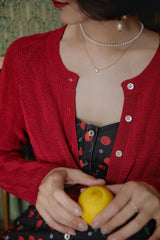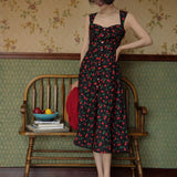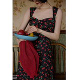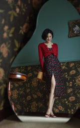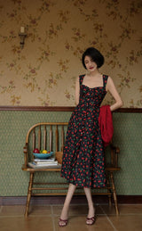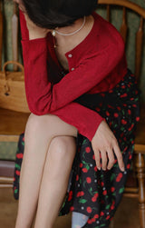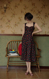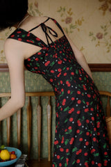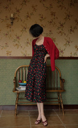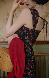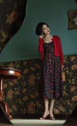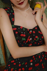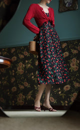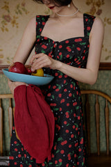 漆黒色に真っ赤なさくらんぼをを描いたレトロなワンピース。ドレープ性のある軽やかな生地が上品で爽やかな印象を与えてくれる。ウエスト位置が高く、裾はボリュームのある広がりを持っています。古き良き時代のエレガントな貴婦人に。