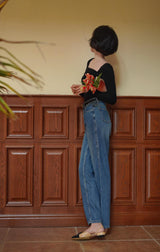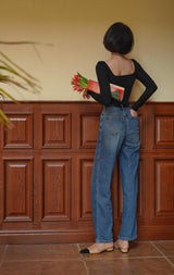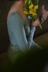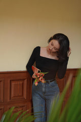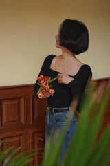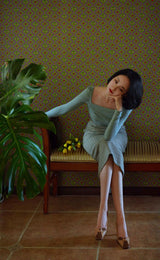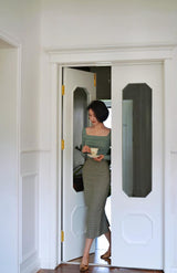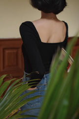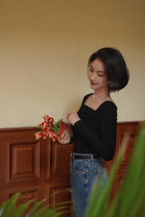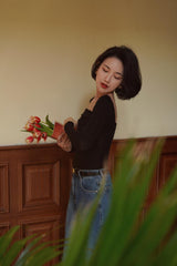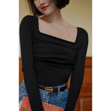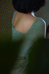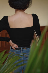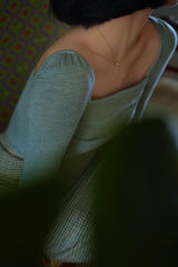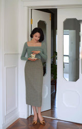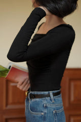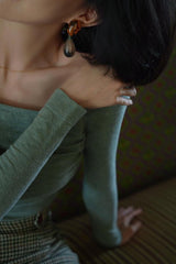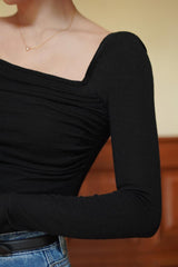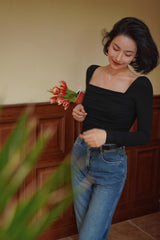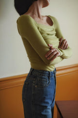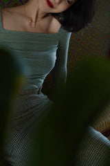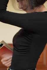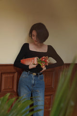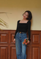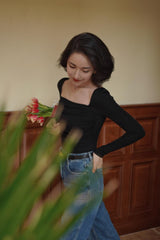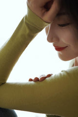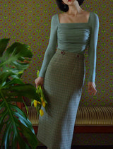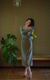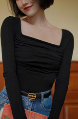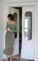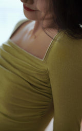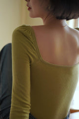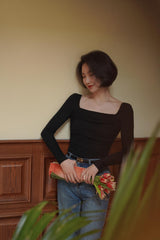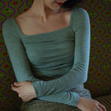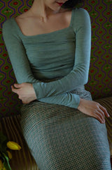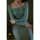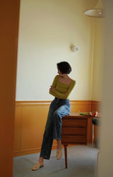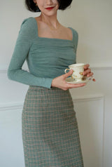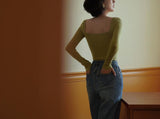 首から胸元の部分を大きく開けて、鎖骨を綺麗に魅せてくれるスクエアネックのスリムニット。上品な印象を与えてくれるアイテムです。胸元にわずかに皺を持たせたデザインとなっています。ハイウエストなボトムスと合わせて、エレガントな貴婦人に。