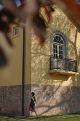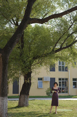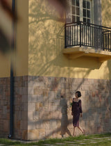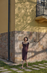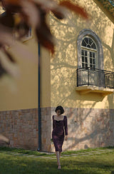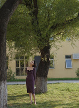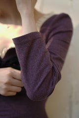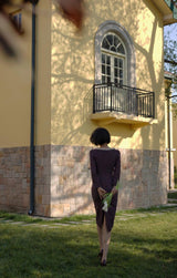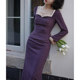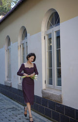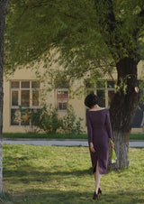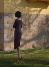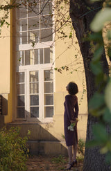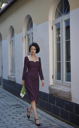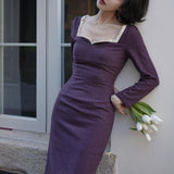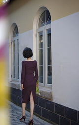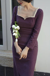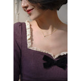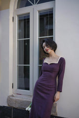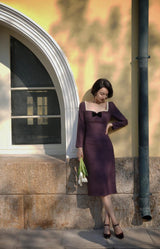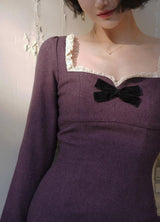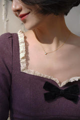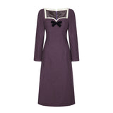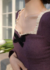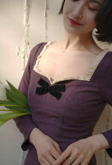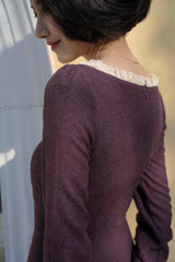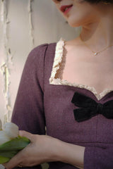 優雅で上品な印象を与えてくれる紫紺色のクラシカルなワンピース。ネックラインにはレースが装飾されており、比較的厚手のウール生地のアイテムです。ウエスト位置が高く、綺麗なシルエットでお召しいただけます。胸元には取り外し可能なベルベットのリボンが装飾されています。