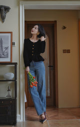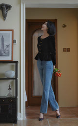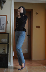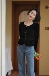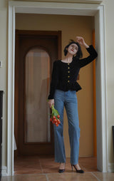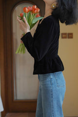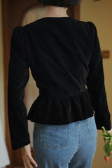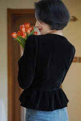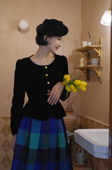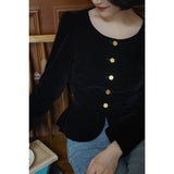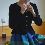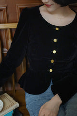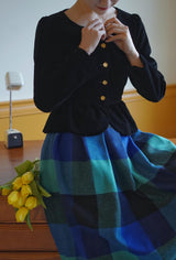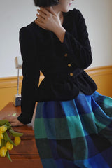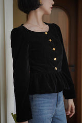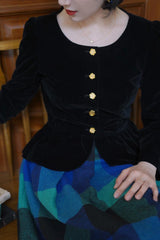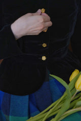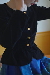 エレガントな貴婦人を一層華やかに演出してくれるブラックのベルベットジャケット。装飾された金色のボタン装飾が美しい。比較的スリムなシルエットで、裾部分はマーメイドなデザインです。華麗で妖艶な雰囲気を演出してみて。