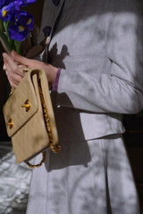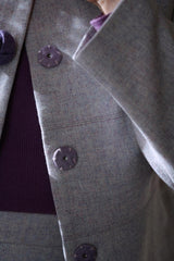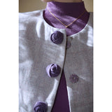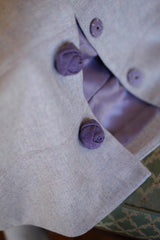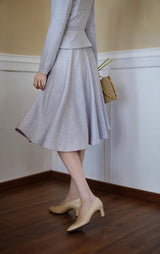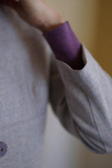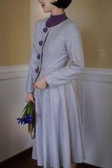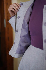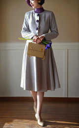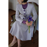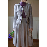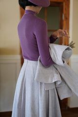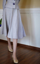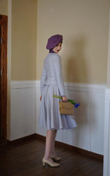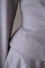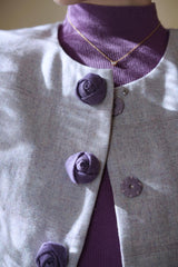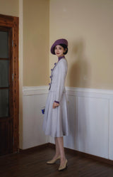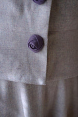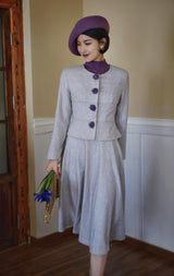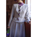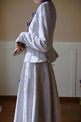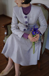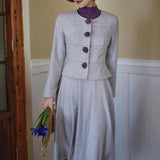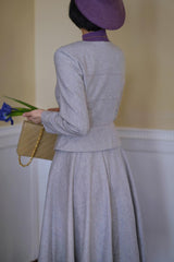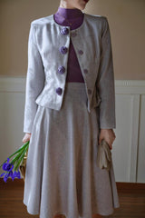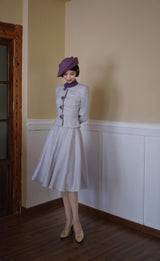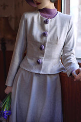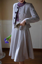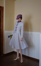 1950年代の映画女優を彷彿とさせる薄藤色のクラシカルなジャケットとアンブレラスカート。ジャケットに装飾された紫色の花びらは優雅で甘やかな印象を与えてくれる。生地は比較的厚みがあります。ふわっと広がるスカートはさりげなく優雅で、纏うだけで気分が上がります。
