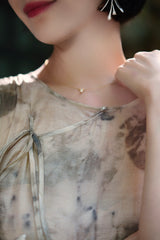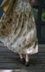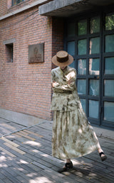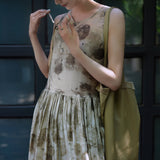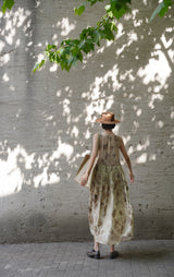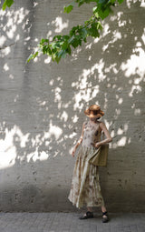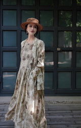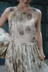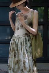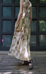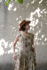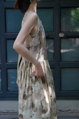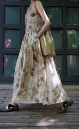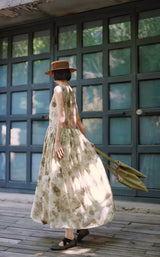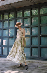 濃淡のある水墨画がレトロな雰囲気。薄墨で描いたロング丈の植物柄ノースリーブワンピース。軽さのあるドレープ感と、ゆったりとしたシルエットが特徴的。肩の前部分で紐を結べるようになっています。控えめな存在感を漂わせて。同柄のジャケットとのセットアップコーデもおすすめです。