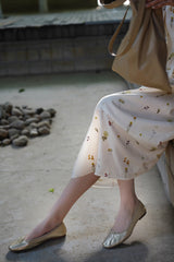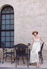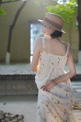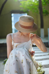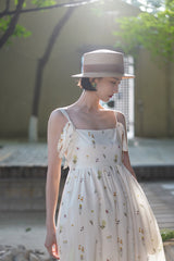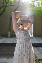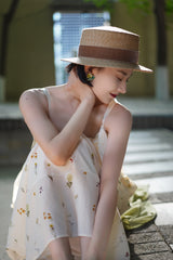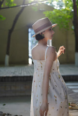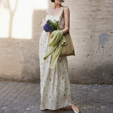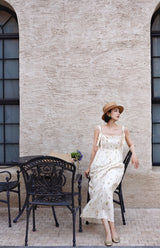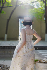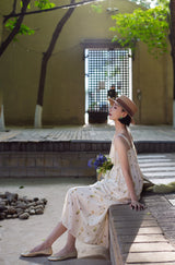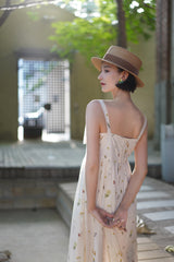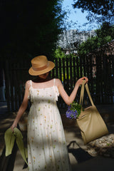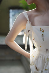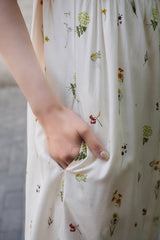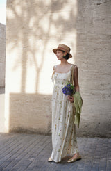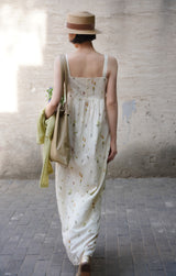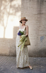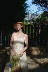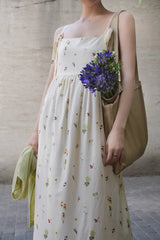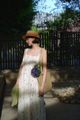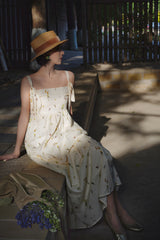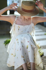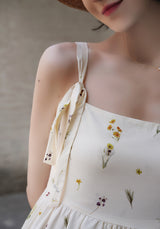 可憐な花をつけた色鮮やかな花々を描いたロング丈のストラップワンピース。自然界が作り出した多様で美しき花々。色彩豊かなイラストは目を楽しませてくれる。長めのストラップはお好みの場所で綺麗なリボンを結んでいただけます。