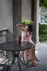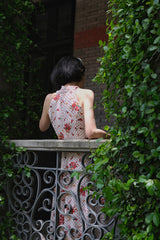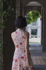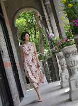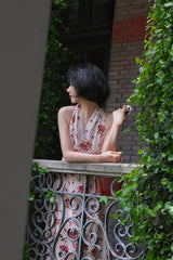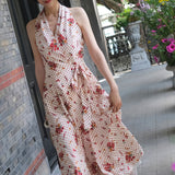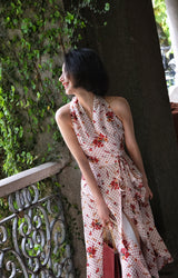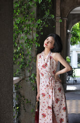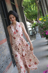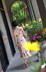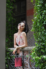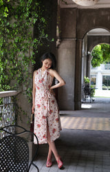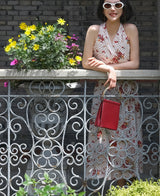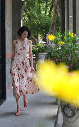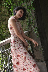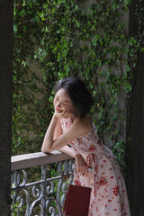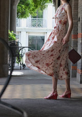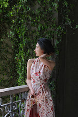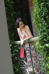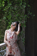 真っ赤に咲いた花々と、水玉模様を組み合わせたノースリーブワンピース。肩まわりを大胆に魅せたアイテムで、ウエスト部分でリボンを結べるようになっており、綺麗なシルエットでお召しいただけます。色鮮やかな存在感に胸が高鳴ります。