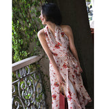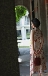 深紅の花と水玉柄ノースリーブワンピース