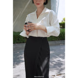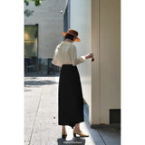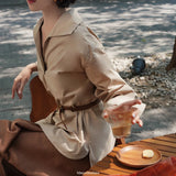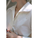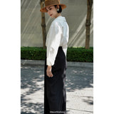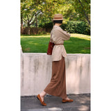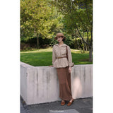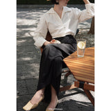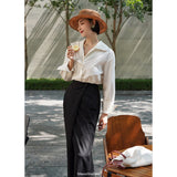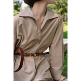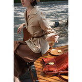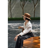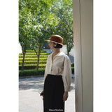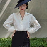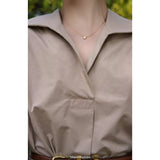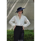 ゆったりとしたシルエットのレトロなブラウス。ネックラインは深めとなっており、お気に入りの首飾りを身につけると素敵。袖部分も長めとなっているので、ロールアップしてお召しください。細身のベルトを合わせると、エレガントな雰囲気たっぷり。