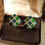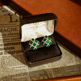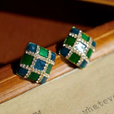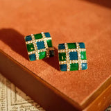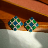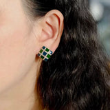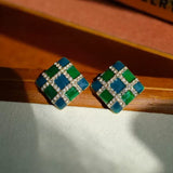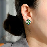 孔雀の美しい青緑の羽のような鮮やかな青緑色に小さな宝石を散りばめたような耳飾り。アール・デコ様式を彷彿とさせる美しさに溢れる幾何学柄。存在感がありながらも、派手になり過ぎない色使い。さりげなく優雅に視線を奪って。