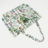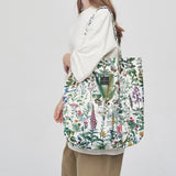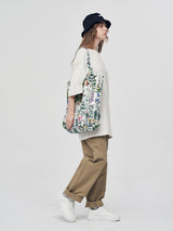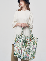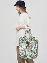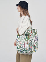 密林の奥に咲く名も知らぬ花々を描いた植物図鑑トートバッグ。色鮮やかな花と溢れかえるような緑は楽園世界みたい。厚手のキャンバス生地で作られており、たっぷりの収納力が嬉しい。内側にはポケットが付属しています。パソコンやお気に入りの本を詰めてお出掛けしてみて。