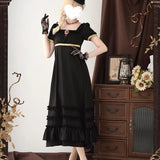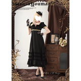 古い洋館に暮らす宮廷王妃のの優雅な日常を想起させるワンピース。胸元やウエストにあしらわれた宝石のような装飾や繊細なチェーン、金色の縁取りが加わり、どこか王侯貴族のドレスを思わせる気品を漂わせています。柔らかく流れるシルエットのロングスカートには幾重ものフリルが重なり、歩くたびに静かに揺れることで、優雅でロマンティックな印象を生み出しています。