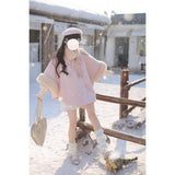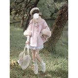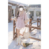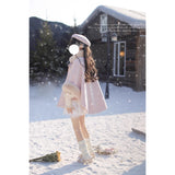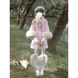 雪の国の妖精が纏うような、淡い夢色のケープコート。やわらかなピンクに包まれたシルエットは、首元と袖を飾るファーがふんわりと温もりを添えています。首元のリボンタイと繊細なブローチが、少女らしい純潔と優雅さを引き立て、まるで白い息とともに甘い魔法が舞い降りるよう。凍てつく空気の中でも心まであたためてくれる、ロマンティックなコート。