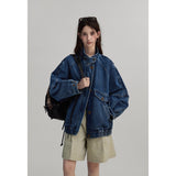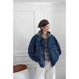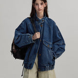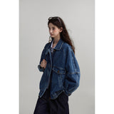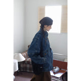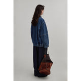 ヴィンテージ感のある風合いが際立つ、オーバーサイズシルエットのデニムジャケット。肩から袖にかけて大きくゆとりを持たせたフォルムが、こなれた抜け感を漂わせています。フロントには大ぶりのフラップポケットや太めのステッチがあしらわれ、ワークウェアの実用的な雰囲気を残しつつ、裾のさりげないギャザーや高めに閉じられるスタンドカラーが、ほんの少しモードで都会的なムードを醸し出しています。気取らないラフさの中に計算されたバランスが光る、日常のスタイルを自然に格上げしてくれるアイテム。