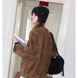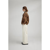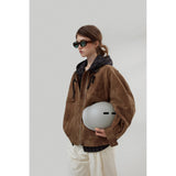柔らかなキャメルブラウンのスエード調素材で仕立てられたジャケット。ほどよいボリューム感と落ち着いた佇まいを併せ持つアイテム。丸みのあるシルエットに、低めのスタンドカラーや大きめのフラップポケット、袖口のストラップディテールがさりげないアクセントとなっています。ゆったりとした肩の落ち感がこなれたムードを生み、着る人の動作に合わせて自然なドレープが生まれる、リラックスした品の良さを感じさせる一着。