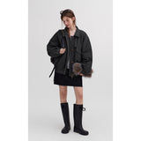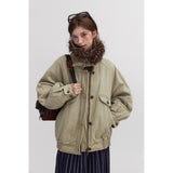 ふわりとしたボリュームとラギッドな佇まいが同居するワークテイストのオーバーサイズジャケット。古着のような風合いのコットン地に、肩周りから袖にかけてゆったりと丸みを帯びたシルエットが特徴的。フロントの大きめのフラップポケットや太めのボタンが無骨さを演出しつつ、首元と袖口にあしらわれた、ふわふわのファーが柔らかな温もりを感じさせます。ワンピースにもスカートにも馴染むラフで可愛い雰囲気を纏ったアイテム。