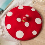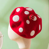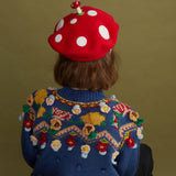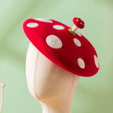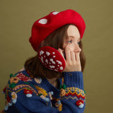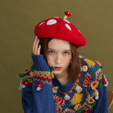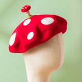 真っ赤なキノコの羊毛フェルトのベレー帽。ウール特有のふくらみと柔らかさのある素材感が特徴的。傘は燃えるように赤く、ふかふかとしており、美しくもあり、愛くるしく、魅惑的。自由な角度で左右に傾けて、お好みのスタイルでお楽しみください。