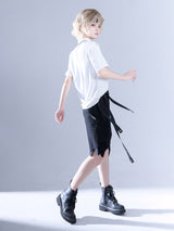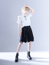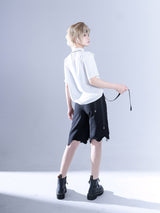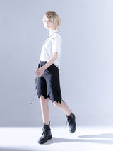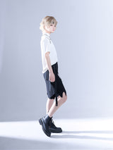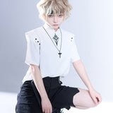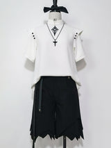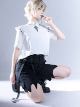 菱形のロズンジ紋章を胸元に描いたハイネックトップスとネックレス。肩先は翼が生えたように張り出したウイングショルダーで、漆黒のボタンが装飾されています。ダークなゴシック世界に誘われてみて。