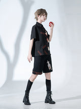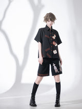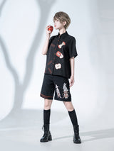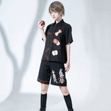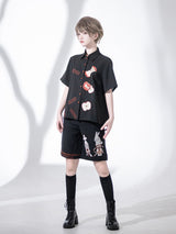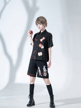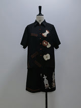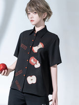 赤く熟れた林檎が刺繍されたブラウスと、兎が刺繍されたハーフパンツ。輪切りにした林檎、芯を残してかじられた林檎。Bad Appleと大胆に刺繍されています。おとぎ話で語れたみたいな童話世界へ誘われてみて。