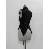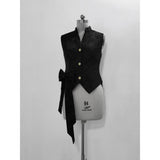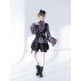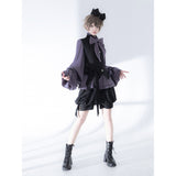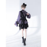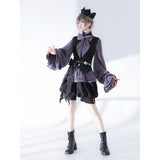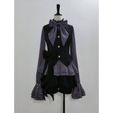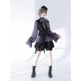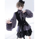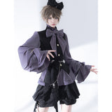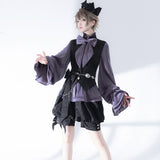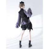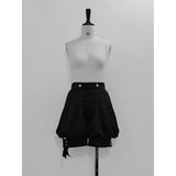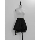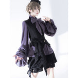 ボリュームのあるゆったりとしたシルエットが特徴的なハイネックなリボンブラウスと、ウエスト部分にリボンが装飾されたベストと、ふわりと膨らんだハーフパンツ。ベストとハーフパンツにはうっすらと花模様が描かれています。ダークな印象の"黒"ながら、ボーイッシュな雰囲気に演出してくれる。