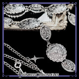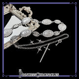 精巧に彫られた銀色のウエストチェーン。西部開拓時代を彷彿とさせるミリタリーなテイスト。銀色に輝く剣や鍵、瞬く星も装飾されています。