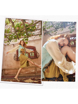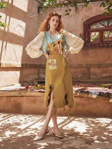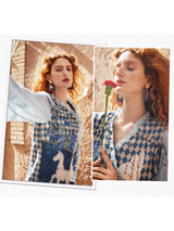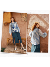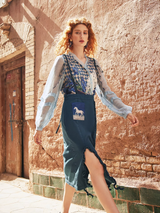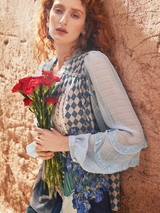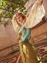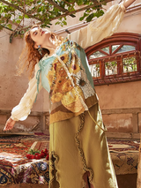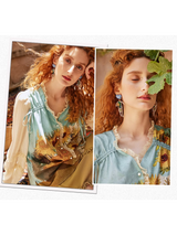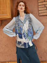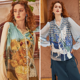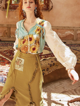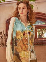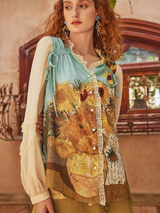 ゴッホの『花瓶の向日葵』と『アイリスのある花瓶』を大胆に描いたシフォンブラウス。首まわりから前立てと、袖にはレース刺繍が装飾されており、ゆったりとした袖はわずかに透け感があります。絵画を纏っているような芸術的なアイテム。