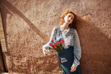 花瓶の向日葵とアイリスのある花瓶のシフォンブラウス