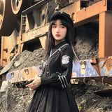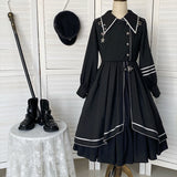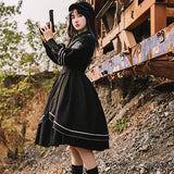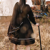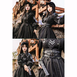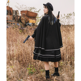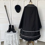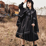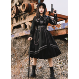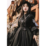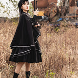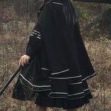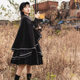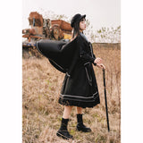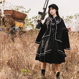 格調高き漆黒の護衛者のゴシックワンピースとゴシックケープ。クールで聡明な”黒”が理知的な勇ましさを演出してくれる。黒地と白線のコントラストに目を奪われる。ワンピースは袖部分に徽章が刺繍され、裾部分はボリュームのある膨らみがあります。