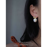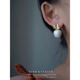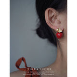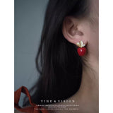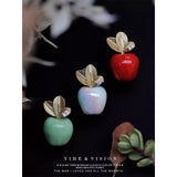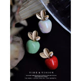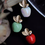 枝先に静かに実る小さな林檎の可憐な実りをモチーフにした耳飾り。丸みを帯びた林檎のモチーフは、艶やかな質感によって瑞々しい果実のような柔らかな存在感を放ち、その上に添えられた繊細な葉の装飾は、秋の庭や果樹園で静かに揺れる枝葉を思わせます。葉脈まで丁寧に表現されたゴールドのリーフは、自然の美しさを小さな装飾の中に閉じ込めたかのようで、耳元でさりげなく輝きながら優雅な印象を生み出します。