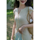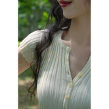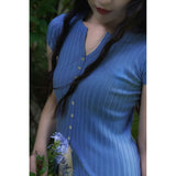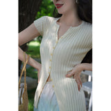 ナチュラルな美しさを引き出してくれるスリムニットトップス。日常使いしやすい陽気なエレガンス。袖は短く、伸縮性のあるテクスチャとなっています。洗練された細やかなディテールが印象的。夏のワードローブに欠かせないアイテム。