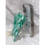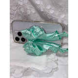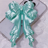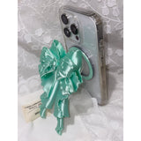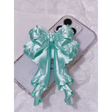 ロマンティックで華やかな大きなリボンが、立体的に飛び出したような、可憐で存在感のあるスマホグリップ。ふっくらと膨らんだリボンの結び目から、繊細なフリルと曲線を描く長いリボンが流れ落ち、まるでドレスの裾が風に揺れた瞬間を切り取ったような優雅なシルエットをつくり出しています。