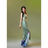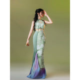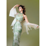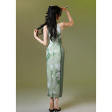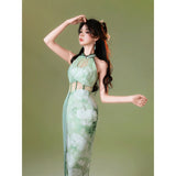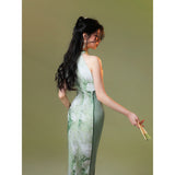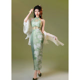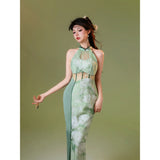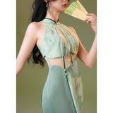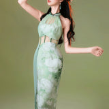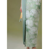 淡いグリーンのベースカラーは、まるで朝霧の中に芽吹いた若葉のよう。滲むような色合いが詩的な幻想を生み出し、風にそっと揺れるクチナシの花が描かれたチャイナワンピース。ホルターネックデザインが、肩から首筋にかけてのラインを上品に引き立て、胸元のシアー素材が、ほんのり透けることでまるで薄霧に包まれた庭園のような神秘的な美しさを醸し出します。ウエストにはレースを切り替えて配置し、繊細な模様が蔦のように絡み合いながら曲線美を描き出しています。東洋の古典的な優美さと、西洋アートのロマンチックなムードを融合させたアイテム。
