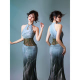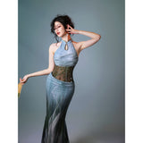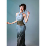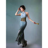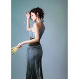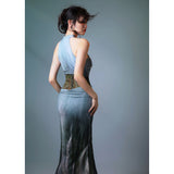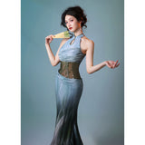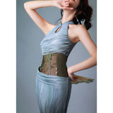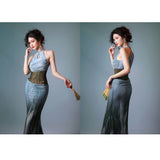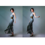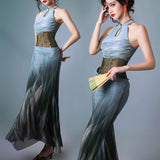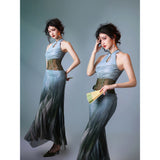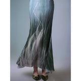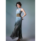 水面に揺れる葦を描いたチャイナワンピース。自然の情景から着想を得た詩情あふれるデザイン。しなやかさと軽やかさを兼ね備えたダブルチュールに、大胆かつ繊細な水墨で描いた葦が重なり合っています。ウエスト部分には透け感のあるカットアウトデザインを採用し、木の葉が刺繍されています。